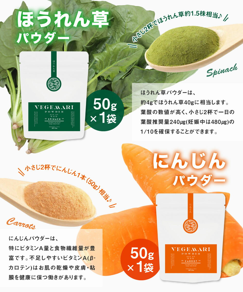 商品説明 名称 VEGEMARI 野菜パウダー 産地 大分県産 内容量 ほうれん草 50g×1袋 にんじん 50g×1袋 かぼちゃ 50g×1袋 ピーマン 50g×1袋 原材料名 ほうれん草、にんじん、かぼちゃ、ピーマン 賞味期限 別途商品ラベルに記載 保存方法 高温・多湿・直射日光を避け、涼しい場所に保管してください。