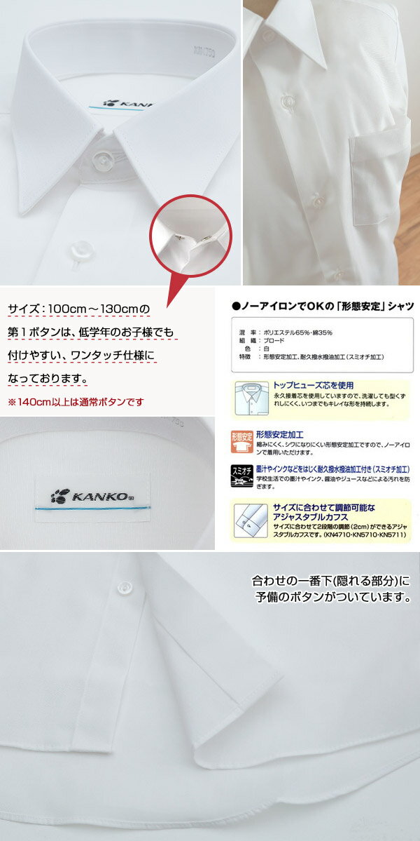 【カンコー男子カッターシャツの特長】・形態安定加工・耐久、撥水撥油加工・トップヒューズ芯を使用・アジャスタブルカフス・100〜130cmまでの第1ボタンはワンタッチ仕様 (140cm以上は通常のボタン)【耐久、撥水撥油加工について】学校生活での墨汁やインク、醤油やジュースなどによる汚れを防ぎます(スミオチ加工)【形態安定加工について】縮みにくくシワになりにくい形態安定加工ですので、ノーアイロンで着用いただけます。